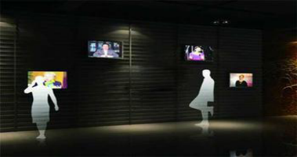 观众看到墙面上多个显示设备中,每个显示画面中都有人物的视频静止影像。每台电视下都有一个控制按钮(可以是自动感应器),当观众按到其中一个时(当自动感应器扑捉有人接近时),视频中的人物就 开始讲述一些关于民间文学、美术、音乐、舞蹈、戏曲、工艺、风土人情、文化等方面的的故事。当其中一位讲解时,其他四几位都会转过脸专注的看着讲述的那位,并仔细地聆听。观众可以通过墙上的按钮或红外感应开关,随时挑选某一画面中的人物讲故事,叙述完毕后,系统会自动让另一个人物开始将新的故事。这个项目是展示传统文化主题的最佳平台,可以将一些平淡的故事经历通过我们特殊、新颖的展示方式变得丰富精彩,引人驻足。